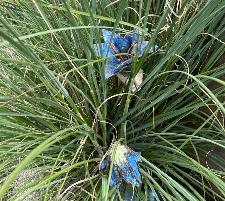 Modellerade fantasiblommor fästa på tunnare armeringsjärn. Förgyller rabatterna!