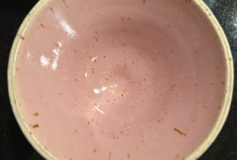 Stengods vilket innebär att det går utmärkt att diska skålarna i maskin etc. Blekt rosa med lavaprickar.